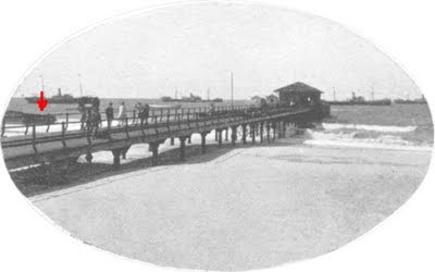 Imagem da Ponte Metálica, 1908. Navio da Ponte no detalhe.